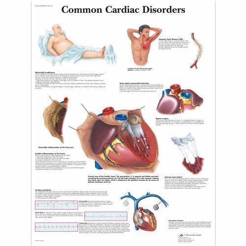 This colorful anatomical chart depicts cardiac diseases. The poster presents useful information about diseases of the human heart.