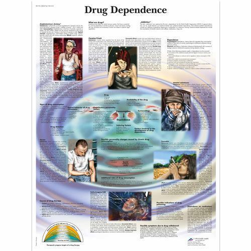 This colorful poster presents a variety of information about dependency on drugs. Consumption, effects, risks and possible long term of effects of several types of drugs are discussed on this poster. This anatomy poster is a great educational tool for teaching about drug dependence. Printed on premium glossy (200g) paper. Convenient Poster size 50 x 67 cm (20 x 26").