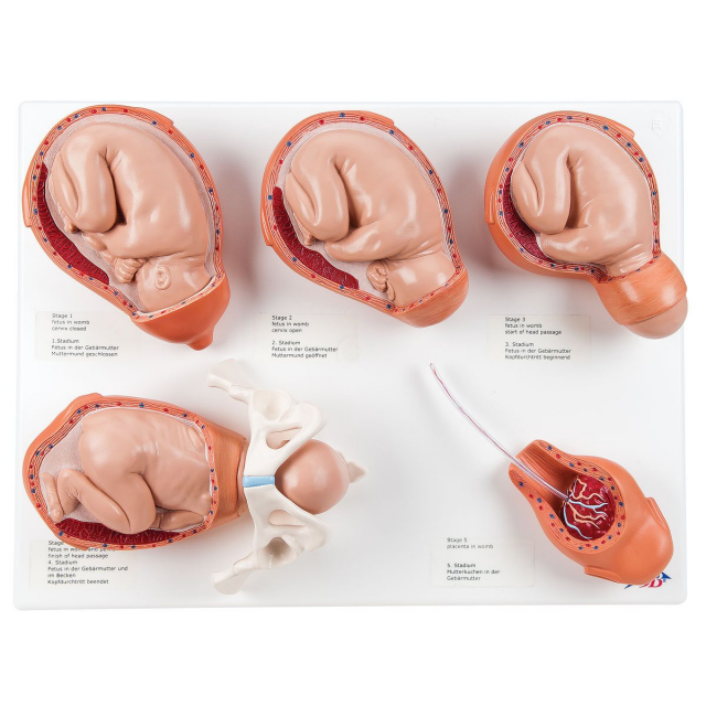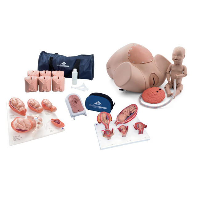 The Obstetrics Lab Kit to study obstetrics from conception to delivery! This is the advanced version of Intro to OB Lab Kit, with even more products than the Basic version! See the growth and development from an embryo to a fetus in detailed life-size models mounted together on a base. Study the stages of birth from a closed cervix all the way to the fetus navigating through the pelvis and delivery of the placenta. Get hands-on practice of identifying birth progress, delivering babies in normal or complicated scenarios, and performing episiotomies of various severities using 3B Scientific simulators. Great for any Obstetrics education class!