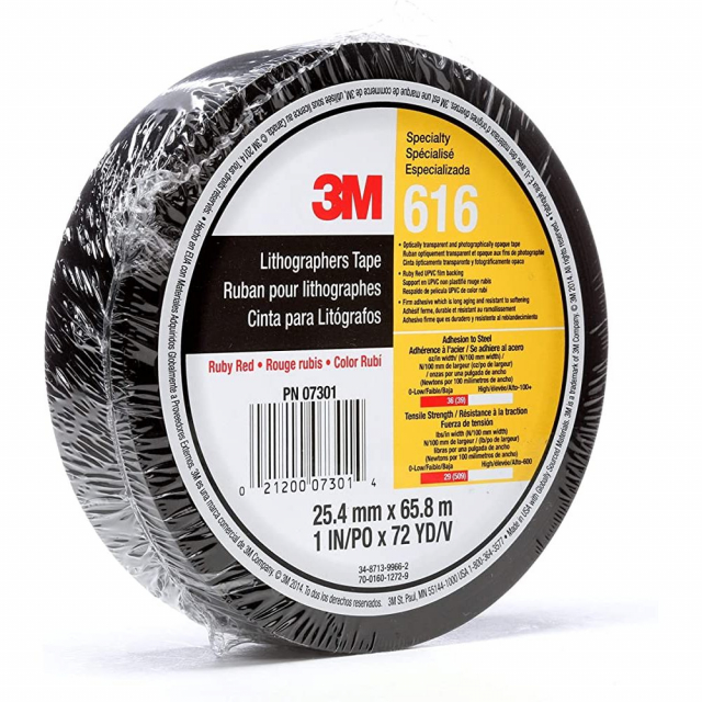 Science you can see. 3M™ Lithographers Tape 616 is a Ruby Red 2.4 mil unplasticized polyvinylchloride (UPVC) film tape with a rubber adhesive. The low caliper, pin-hole free, colored backing allows for accurate positioning while minimizing ghosting and simultaneously providing sharper definition with a continuous opacity to light to help minimize retouching. This tape is resistant to changing atmospheric conditions which allows for repeated and extended burn times. It is designed with a firm, long-aging rubber adhesive that is resistant to softening. It resists oozing during both application and storage, ensuring a long life and continued performance during processes.
