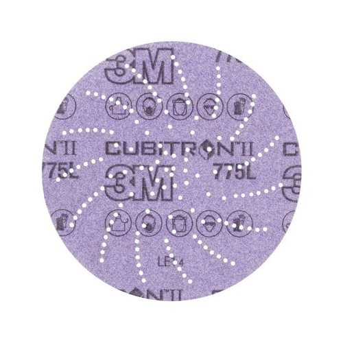 3M Xtract™ Cubitron™ II Disc 775L features a 3M proprietary multi-hole pattern for improved dust extraction in finishing applications. Part of the 3M Xtract™ Series, designed for optimal dust removal. An innovative multi-hole pattern extracts dust better than 5- or 6-hole products - increasing cut and dramatically increasing disc life. The design does not need to align with the disc pad holes, making switching the discs fast, easy and convenient. Featuring ceramic 3M Precision-Shaped Grain, a revolutionary advancement in abrasive technology. The triangular shaped ceramic mineral is designed to slice through the substrate, rather than gouging or"plowing" like conventional abrasives, resulting in a disc that cuts up to 2x as fast as conventional abrasives. The film backing delivers outstanding tear resistance, flexibility and a consistent, uniform finish on a variety of substrates.