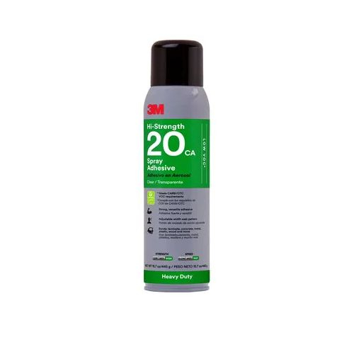 3M™ Heavy Duty 20CA Spray Adhesive is a clear, high-strength adhesive that bonds a range of large surfaces and is perfect for large-scale laminations. It shows aggressive initial tack with an extended open bond time of up to one hour. The lace spray pattern with high solids content supports the low soak-in property and provides high coverage. The combination of fast tack, strong bond and clean appearance make it ideal for large bonding projects. This adhesive is GREENGUARD™ certified, helps contribute to LEED® credits and meets CARB and OTC VOC requirements. (LEED - Leadership in Energy and Environmental Design; CARB - California Air Resources Board; OTC - Ozone Transport Commission; VOC - Volatile Orga-nic Compounds)
