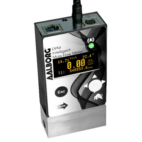 Aalborg Instruments DPM series digital multi-parameter mass flow meter provides accurate measurements of mass flow rate, volumetric flow rate, pressure and temperature of process gases. It can be used in a variety of industries: scientific and analytical applications, bioreactors and surface depositions, gas sampling, manufacturing and metrology activities. DPM series digital mass flow meters incorporate multi-parameter multi-gas functionality which allows users on site to select up to 30 different gases locally via optional OLED/Joystick interface, remotely via the RS232/RS485 interface or optional Modbus RTU interface. Standard acuracy is +/- (0.5% RDG + 0.2% FS). Turn down ratio is 200:1. Response time is 10-20 ms. DPM flow meters support various functions including: two programmable flow totalizers, low, high or range flow, temperature and pressure alarms, automatic zero adjustment (activated via local or communication interface), programmable SSR relay, programmable 0-5 Vdc, 0-10 Vdc or 4-20 mA analog outputs, user-programmable pulse output (via SSR), and extensive self-diagnostics functionality. Significant savings become apparent when comparing the cost of a single DPM meter embodying these features, with that of acquiring and installing multiple, application-specific devices.