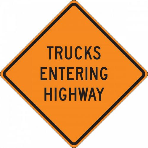 36" x 36" Fluorescent Vinyl Roll-Up Construction Sign with Legend: "Trucks Entering Highway"