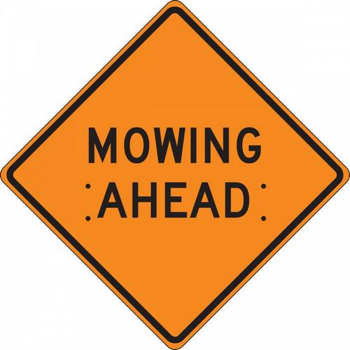 48" x 48" Fluorescent Vinyl Roll-Up Construction Sign with Legend: "Mowing Ahead"