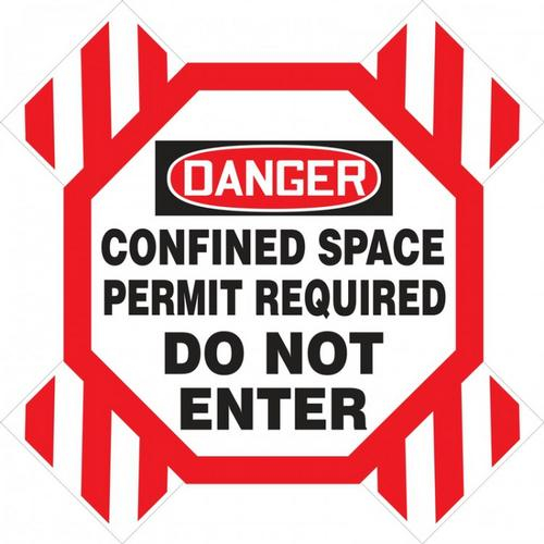The crossbuck design fits onto the bolt pattern of a vertical confined space entrance. The attention-getting diagonal red-white stripes and center octagonal sign features the color, layout, and confined space warning message as specified by OSHA/ANSI. Adjustable crossbucks pivot flat for easy transport and storage. The 11 1/2" x 11 1/2" octagon sign is printed on .055" polyethylene plastic. Each arm of the printed crossbucks measure 6" x 42" with 1 1/2" x 9" slotted cutouts at the four ends to fit the bolt pattern across the entry-way - fits 22" to 38" outside bolt-to-bolt.