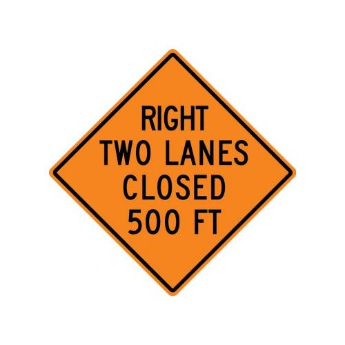 30" x 30" High Intensity Prismatic Rigid Construction Sign with Legend: "Right Two Lanes Closed 500 Ft"
