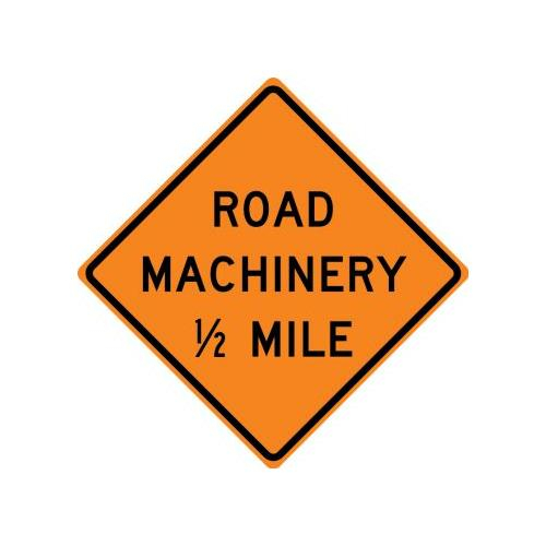 30" x 30" DG High Prism Rigid Construction Sign with Legend: "Road Machinery 1/2 Mile"