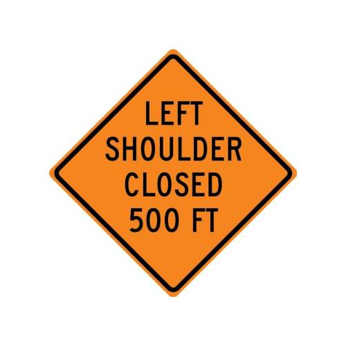 30" x 30" DG High Prism Rigid Construction Sign with Legend: "Left Shoulder Closed 500 Ft"