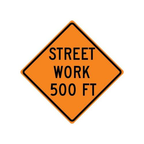 36" x 36" DG High Prism Rigid Construction Sign with Legend: "Street Work 500 Ft"