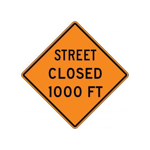 30" x 30" DG High Prism Rigid Construction Sign with Legend: "Street Closed 1000 Ft"