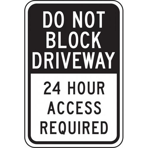 Sign with Legend: "Do Not Block Driveway 24 Hour Access Required". Inform motorists not to block a driveway due to it being needed 24 hours a day.
