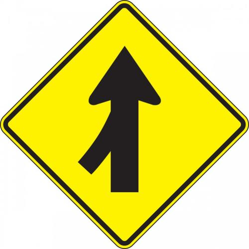 Inform road-users of a upcoming merge from the left lane on the roadway.