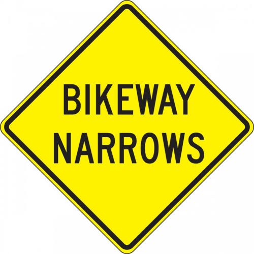 Inform bicyclists that the path will narrow in a distance and to be cautious.