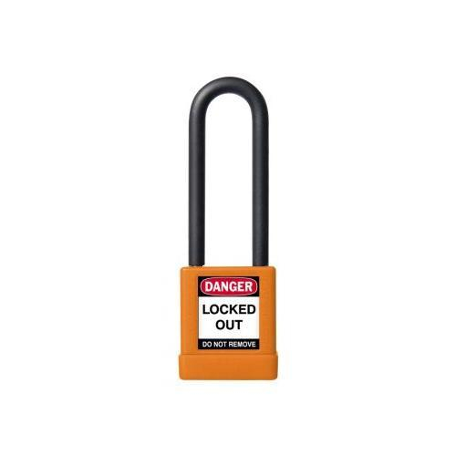 Plastic-covered safety padlocks are insulated to prevent electric shock. Lock components are non-magnetic and non-sparking making it ideal for use in lockout/tagout procedures. The corrosion resistant brass body stands up to the harshest environments including chemical washdowns and high-pressure cleaning found in food and beverage facilities. The solid brass body is encased by a colored plastic cover for quick recognition and distinction