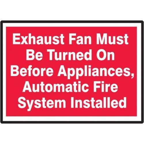 Accuform, LFXG501XVE, 3-1/2" x 5" Fire Safety Label "Exhaust Fan Must Be Turned On Before Appliances, Automatic Fire System Installed" Adhesive Dura Vinyl