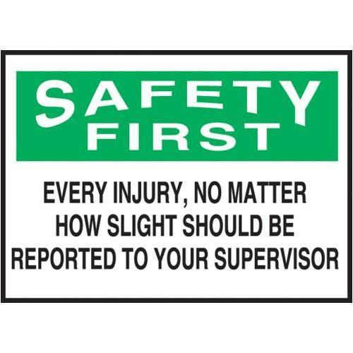 Accuform, LGNF930VSP, 3-1/2" x 5" OSHA Safety First Label "Every Injury, No Matter How Slight Should Be Reported to Your Supervisor" Adhesive Vinyl