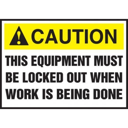 Accuform, LLKT607XVE, 3-1/2" x 5" ANSI Caution Safety Label "This Equipment Must Be Locked Out When Work Is Being Done" Adhesive Dura Vinyl