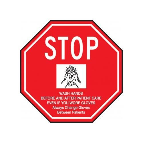 Accuform, LRST501XVE, 4" x 4" Safety Label "Stop Wash Hands Before and After Patient Care Even If Wore Gloves - Always Change Gloves Between Patients" Adhesive Dura Vinyl