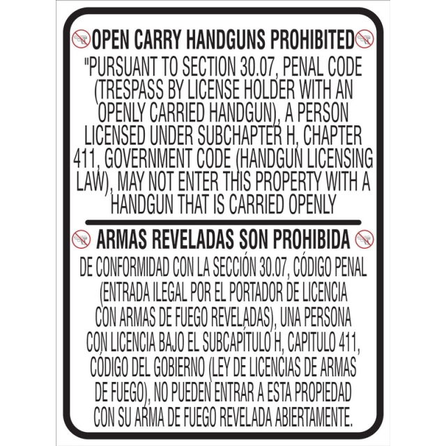 Accuform, MACC509XT, Bilingual Texas 30.06 Regulation Safety Signs: Prohibiting Handguns In A Business Or Other Entity 24" x 18" Dura-Plastic