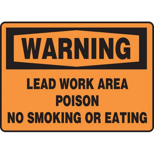 OSHA Sign: " Warning Lead Work Area Poison No Smoking or Eating". Restrict smoking and eating to protect employees from accidental lead poisoning.