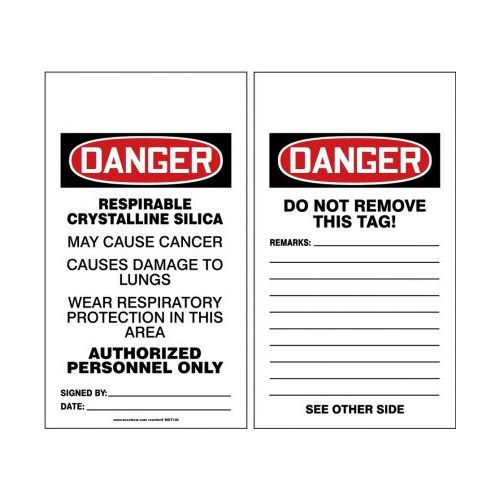 Accuform, MDT130LTM, OSHA Danger Safety Tag "Respirable Crystalline Silica May Cause Cancer - Causes Damage To Lungs - Wear Respiratory Protection in This Area"