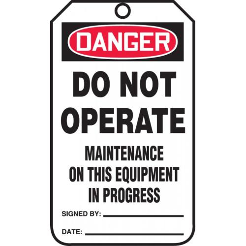 Tag size - 5-3/4" x 3-1/4". Tag: "Do Not Operate Maintenance on This Equipment in Progress"