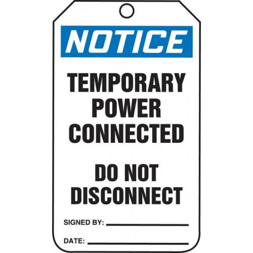 Tag size - 5-3/4" x 3-1/4". Tag: "Temporary Power Connected Do Not Disconnect"