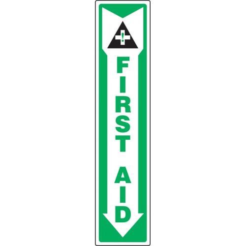 Accuform, MFSD500VA, 18" x 4" Aluminum Sign: "First Aid" & Down Arrow Symbol