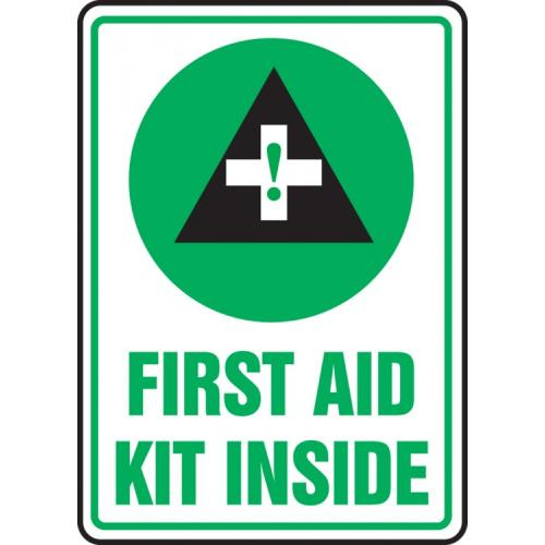 Accuform, MFSD538VA, 14" x 10" Aluminum Sign: "First Aid Kit Inside" & Symbol