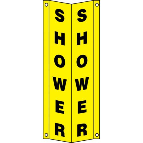 Make sure everyone is aware of the location of your shower station with this 3D sign. The tall yellow sign has contrasting bold black letters. Each message panel is 36" x 6" and made of .125" plastic. The sign's projection angle is 45 degrees from the wall to be seen from the front and sides. Install the 3D (2-panel) on the wall or vertical surface directly near the eyewash or shower station. Has four corner mounting holes. Screws and self-adhesive foam tape included for mounting.