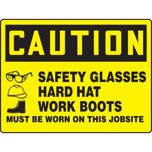 Sign: "Safety Glasses, Hard Hat, Works Boots Must Be Worn on This Jobsite"