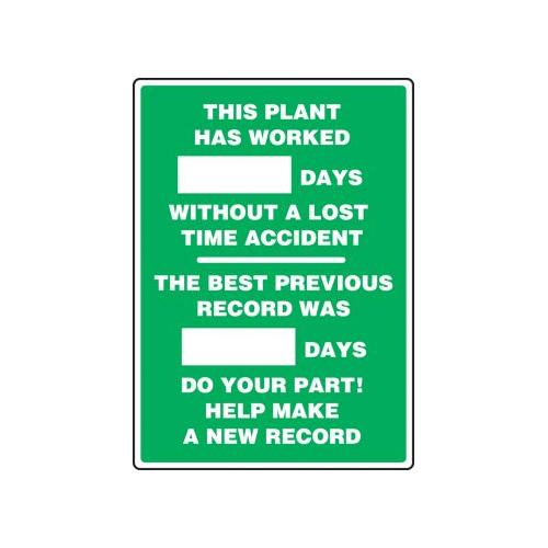 Accuform, MSR126PL, 20" x 14" Write-A-Day Scoreboard "This Plant Has Worked _ Days Without a Lost Time Accident - the Best Previous Record Was _ Days - Do Your Part!" Plastic