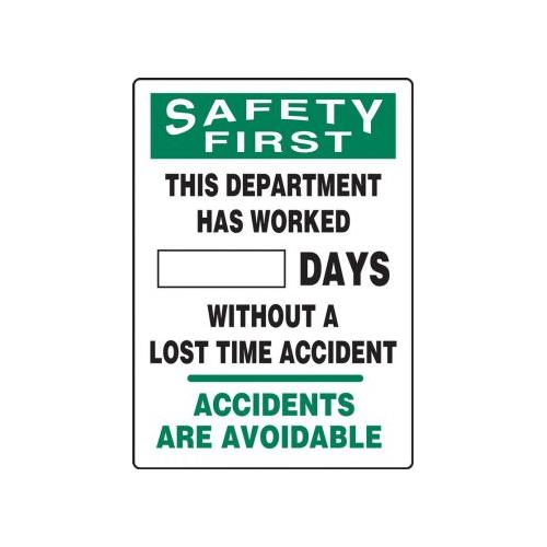 Accuform, MSR134PL, 20" x 14" OSHA Safety First Write-A-Day Scoreboard "This Department Has Worked _ Days Without a Lost Time Accident - Accidents Are Avoidable" Plastic