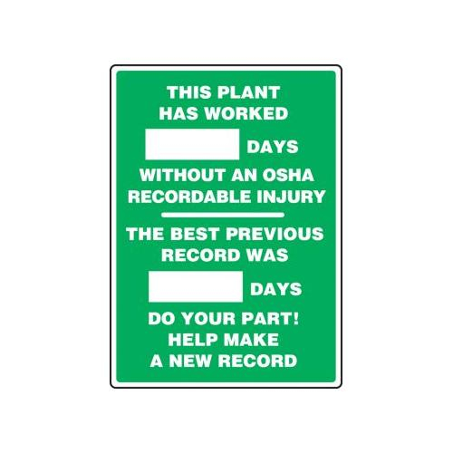 Accuform, MSR248PL, 28" x 20" Write-A-Day Scoreboard "This Plant Has Worked _ Days Without An OSHA Recordable Injury - the Best Previous Record Was _ Days - Do Your Part" Plastic