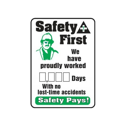 Accuform, MSR260PL, 28" x 20" Write-A-Day Scoreboard "Safety First - We Have Proudly Worked _ Days with No Lost Time Accidents - Safety Pays!" Plastic