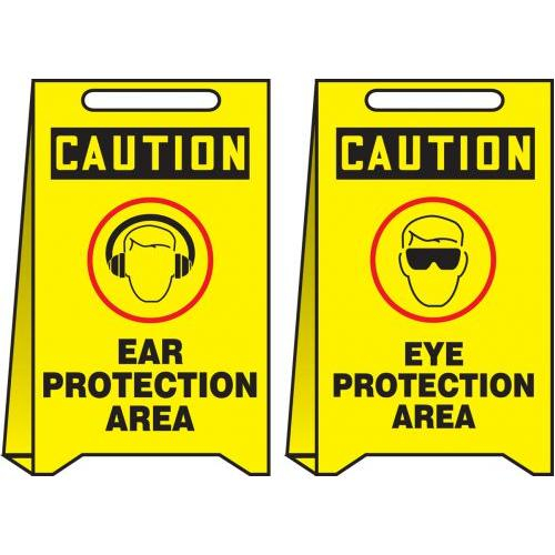 Accuform, PFE440, 20" x 12" OSHA Caution Reversible Fold-Ups Floor Sign "Ear Protection Area - Eye Protection Area" Corrugated Plastic
