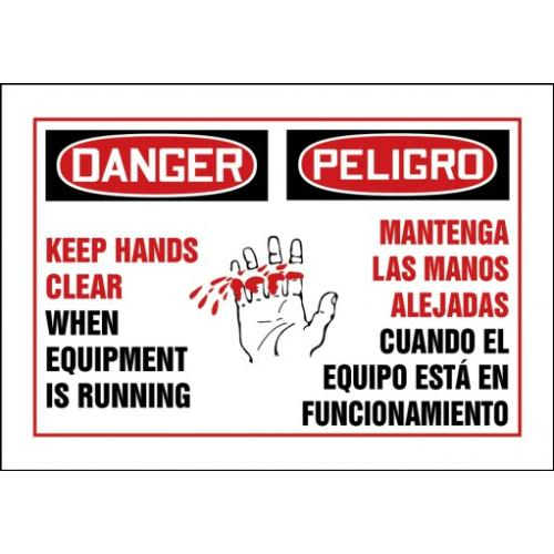 Accuform, SBLEQM034XVE, 3-1/2" x 5" Bilingual OSHA Danger Safety Label "Keep Hands Clear When Equipment Is Running" Adhesive Dura Vinyl