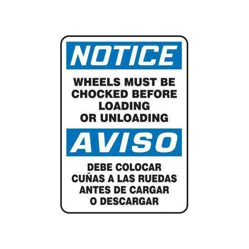 Accuform, SBMVHR842XV, 14" x 10" Bilingual OSHA Notice Safety Sign "Wheels Must Be Chocked Before Loading Or Unloading" Adhesive Dura-Vinyl