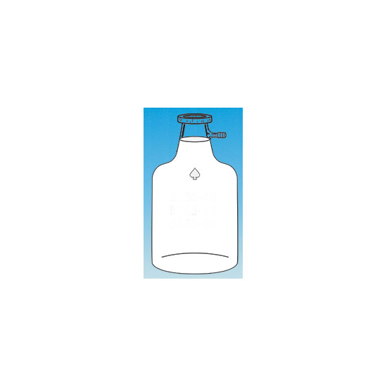 Solution bottle with serrated vacuum take-off. Coated to the neck with a plastic safety coating. This translucent coating forms a protective film around the glass that will help contain both particles and dangerous chemicals should the glass break. Maximum temperature limit is 80°C. Has sloping shoulders similar to a carboy. Neck is tooled for uniform fit with stopper (NOT supplied). Approximate capacity is 13.25 L (3.5 gallons). Approximate diameter is 238mm; approximate height is 438mm. Use rubber stopper #12. Use with 7/16-inch or 1/2-inch I.D. tubing, size F hose connection.