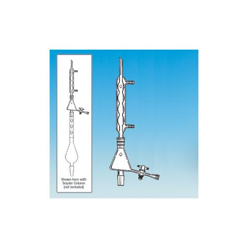 When attached to the top of Snyder Column, unit is designed to recover solvent normally lost during Kuderna-Danish Evaporative Concentrations. PTFE stopcock (1:5, 2mm bore) provides option for total reflux or takeoff. #7 Ace-Thred on side arm accepts tubing 6 - 7mm O.D. 5029-10 Nylon bushing and FETFE O-Ring supplied with adapter.