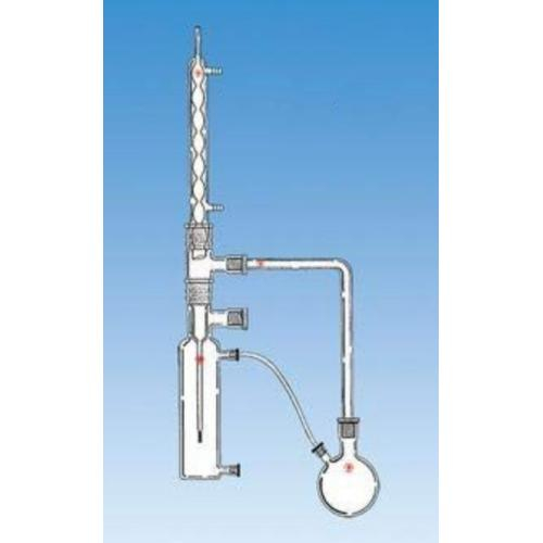 A liquid-liquid extractor for Use with lighter-or heavier-than-water extracting solvents. Overflow and boil-up tube uses Ace-Thred connections, thus allowing easy removal for cleaning to reduce cross-contamination among samples.Complete item consists of extractor body (approx. 1300 mL capacity), dispersion tube adapter, lighter-than-water and heavier-than-water elbow tubes, PTFE solvent return tube for heavier-and lighter-than-water, flask, condenser, (2) #25 nylon bushings with FETFE o-rings, and one #7 nylon bushing with FETFE o-ring.