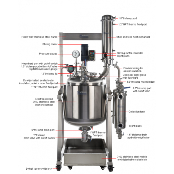- Rest of reactor in 304 grade stainless steel, including motor coupling, triclamps, temp/pressure gauge adapters, and chassis.