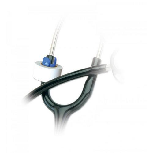 A unique tape holder designed to keep medical tape secure to any stethoscope and ready for use.