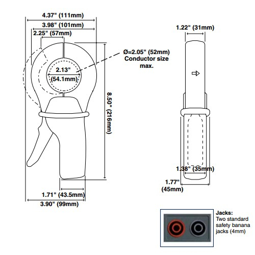 The SR601 is a general purpose 1000AAC current probe designed for use with DMMs, loggers and other instruments that have a current input. It has a 1000:1 ratio and output of 1mA per amp measured in the jaw. The SR601 has jack output termination that accept 4mm banana plugs. Features diode protection for open secondary (output). The rounded jaw design on this probe makes it well-suited for power applications where high accuracy and low phase shift is important.
