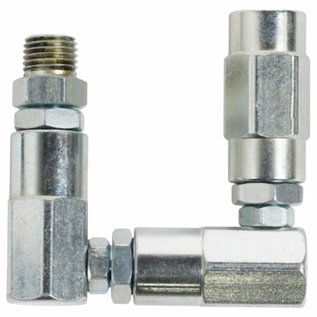 Heavy-duty steel installed between delivery hose and grease control valve prevents hose twisting.