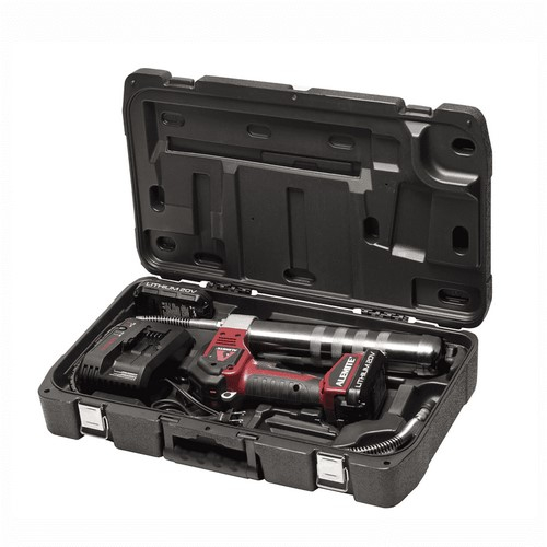 The 20-Volt, Lithium-Ion Grease Gun for maintenance professionals features built-in intelligence. The Model 596 has a multi-function, liquid crystal display (LCD) that indicates cartridge level, battery charge level and grease dispensed. The grease gun alerts the operator of a stall condition or loss of prime. With a maximum pressure of 10,000 psi, the two-speed grease gun delivers up to 24 grease cartridges per battery charge.