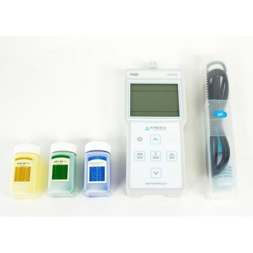 Reliable Structure, IP57 Waterproof and Dustproof, ideal for use in harsh environments. It comes with a complete test kit including a meter, and 3 calibration solutions (pH 4, 7, 10) in a rugged carrying case (no pH electrode). Powered by AA Batteries.