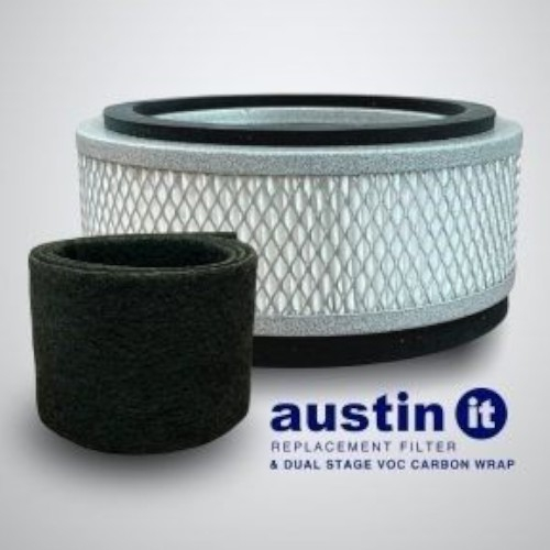 The Austin Air it Personal HEPA with VOC Wrap Replacement Filter FR100C is made for use with the Austin Air it Personal HEPA Air Purifier. This upgraded dual-stage filter package features both Medical-Grade HEPA filtration that captures up to 99.97% of particles down to 0.3 microns and a VOC Carbon Wrap that absorbs pollutants. Together, they filter out dust, pollen, pet dander, bacteria, viruses, chemicals, gasses, odors, smoke, VOCs, and more. VOC wrap lasts up to 3 months under normal conditions, and the HEPA filter lasts up to 5 years under normal residential use. The Carbon Wrap filter also functions as the pre-filter and can be purchased separately if needed.