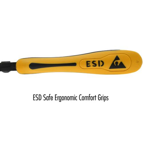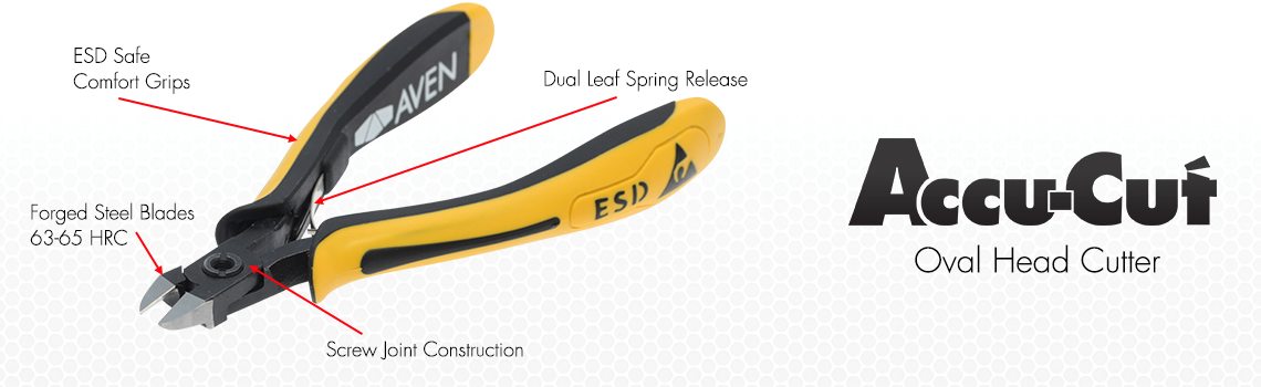 Strong, versatile and long lasting, Accu-Cut cutters are renowned for their superior cutting edge technology. Cutting edges have a hardness of 63-65 HRC for exceptional durability and are sharpened cut crisply at the very tip and along the entire length of the cutting edge. Unique joint design also ensures that the cutting edges stay in perfect alignment for superior performance. Grips are ESD Safe and ergonomically designed to exceptional comfort to increase operator productivity.